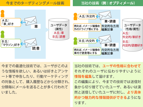 "オプティメール" は、店頭でお客様を前に話をする店員のように、受け手の性格や心理状態に合わせてメッセージを差替え、ひとりひとりの心に届くコンテンツ配信を可能にします。